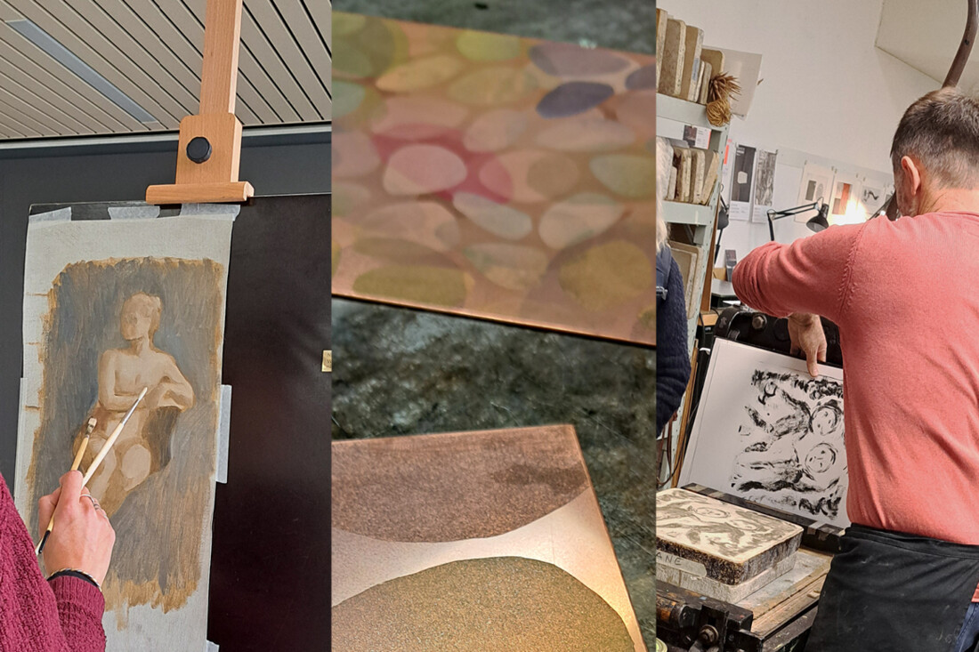 Sie können in unseren Werkstätten Dozierenden und Kursteilnehmenden beim Arbeiten zuschauen oder selbst zeitgenössische und traditionelle Verfahren ausprobieren. Die Angebote in unseren Werkstätten reichen vom Linolschnitt, Siebdruck, Kupferdruck und Lithografie über Batik, Aktzeichnen sowie realistischer Ölmalerei bis hin zu Buchbinden und Elementarer Typographie.